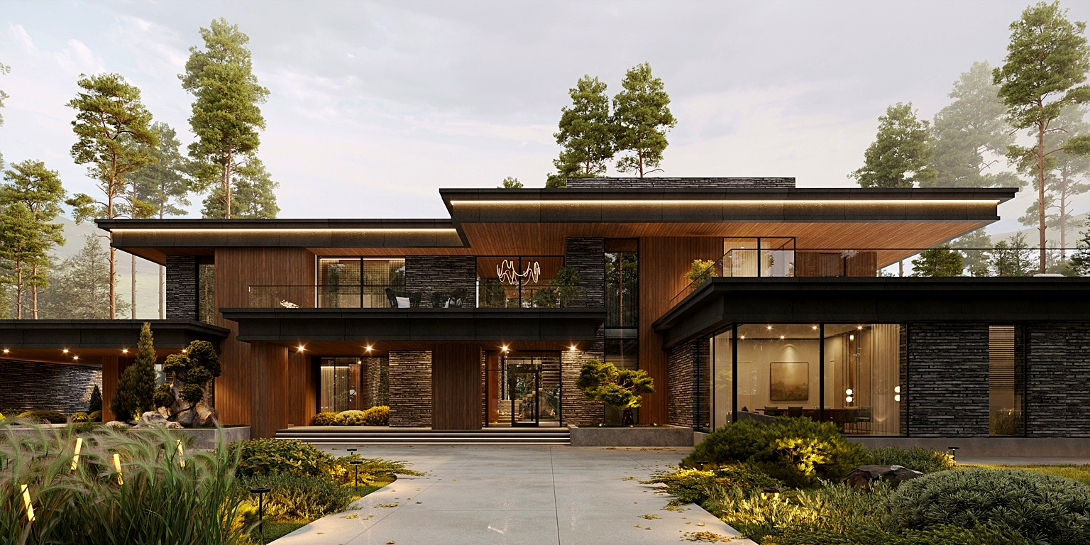 Интерьер и экстерьер словно перетекают друг в друга: панорамное остекление открывает виды на сосновый лес и горные вершины, наполняя пространство светом и воздухом. Каждое решение, от фактуры фасада до геометрии террасы, продумано для того, чтобы подчеркнуть естественную красоту окружающей природы.