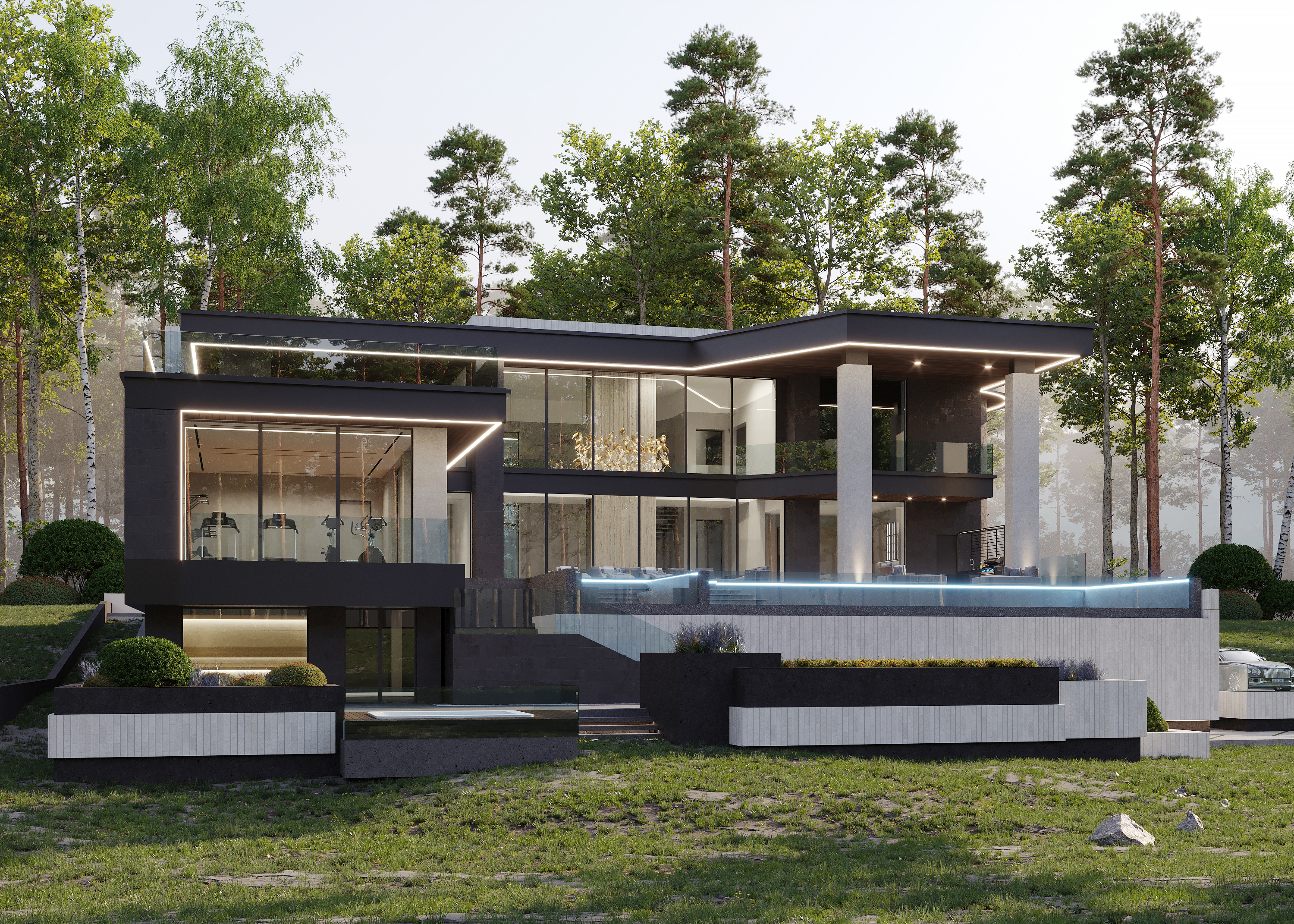 Фасад выполнен в сдержанной цветовой гамме: сочетание холодного серого камня, белых панелей и темных акцентов придает зданию утонченную элегантность. Благодаря стеклянным стенам интерьер буквально растворяется в ландшафте, позволяя природе стать частью архитектурного замысла.