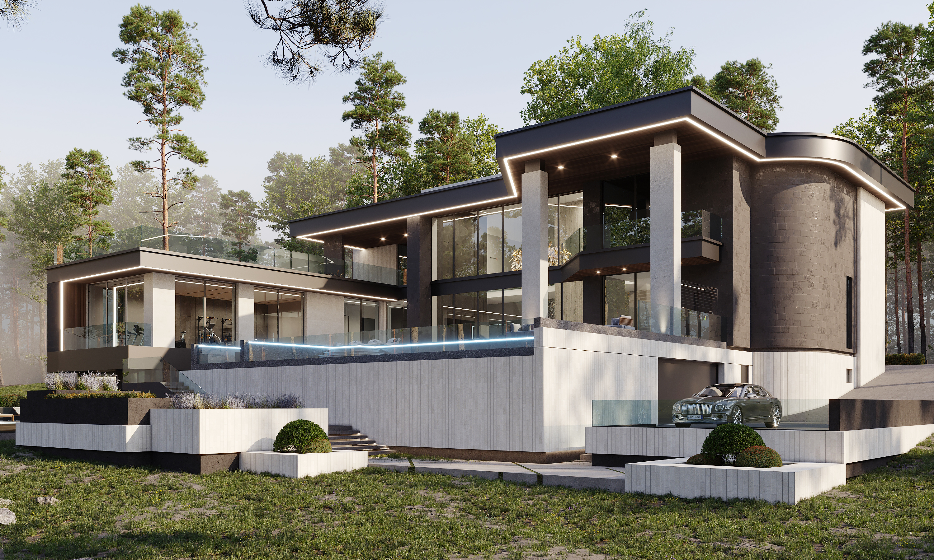 Центральным элементом композиции выступает просторная терраса с эффектным бесконечным бассейном, создающим визуальное продолжение горизонта. Уровневая организация территории обеспечивает плавный переход между зонами отдыха — от уютного спа-пространства и сауны до открытых лаундж-зон у воды.