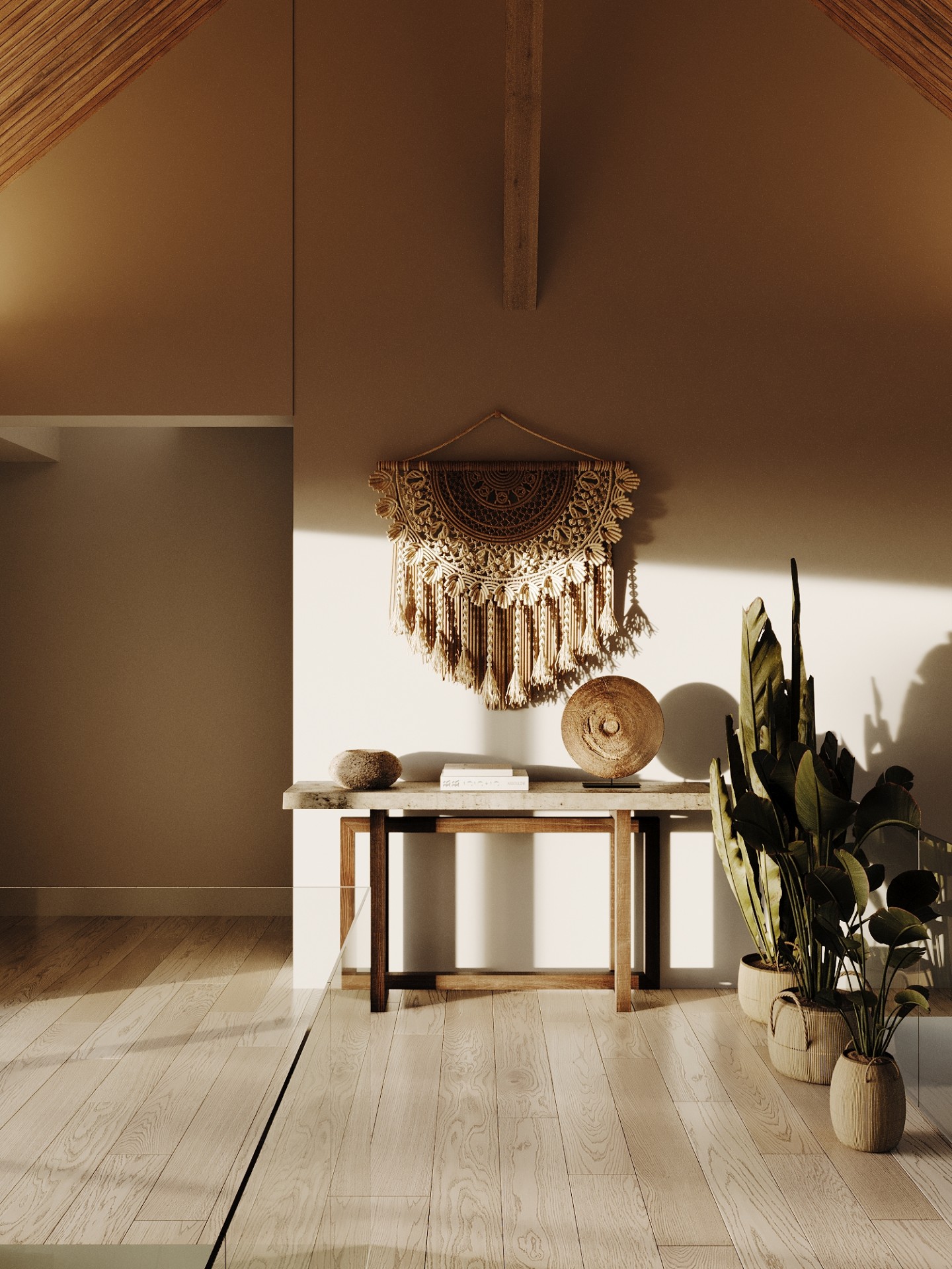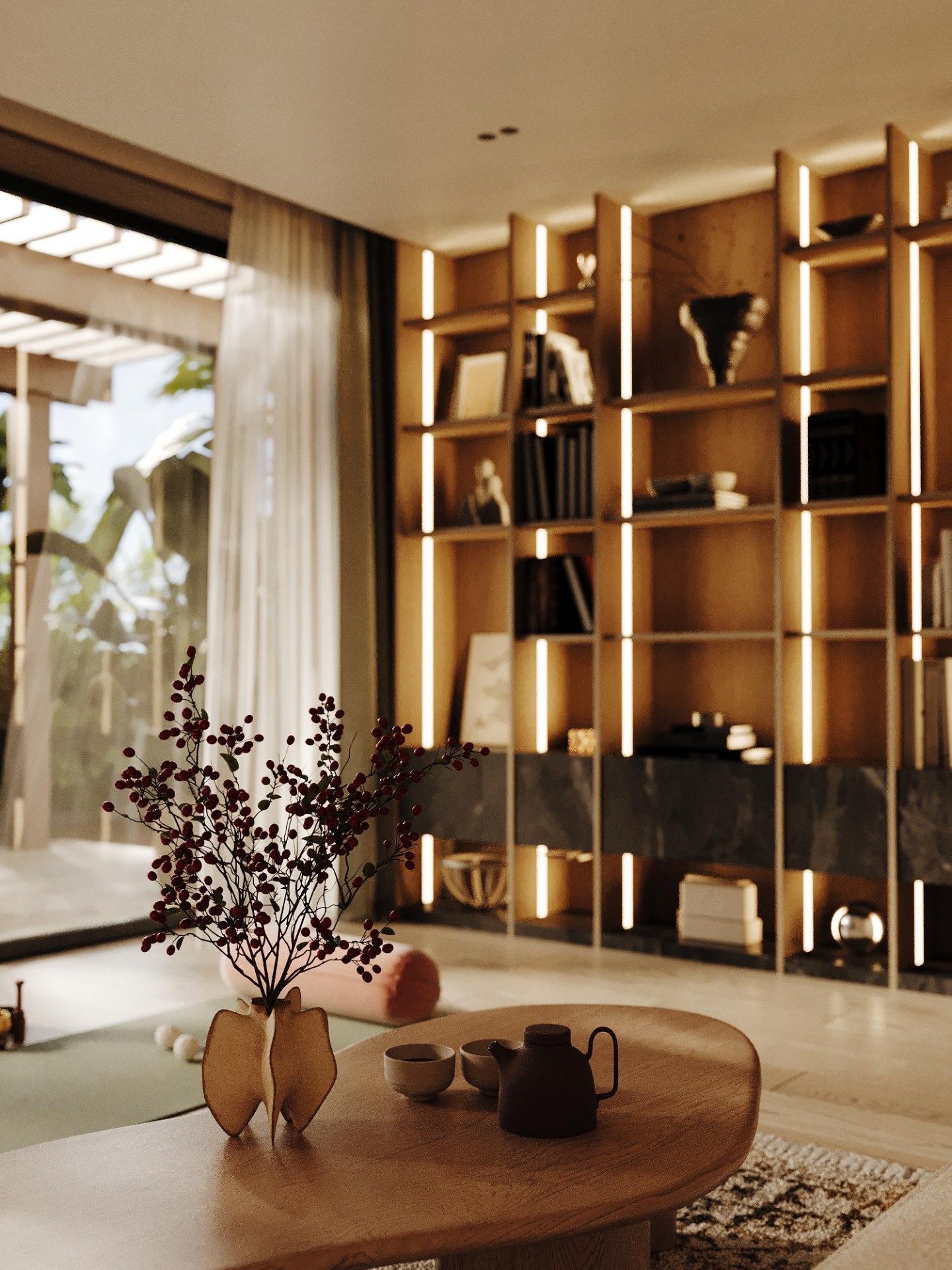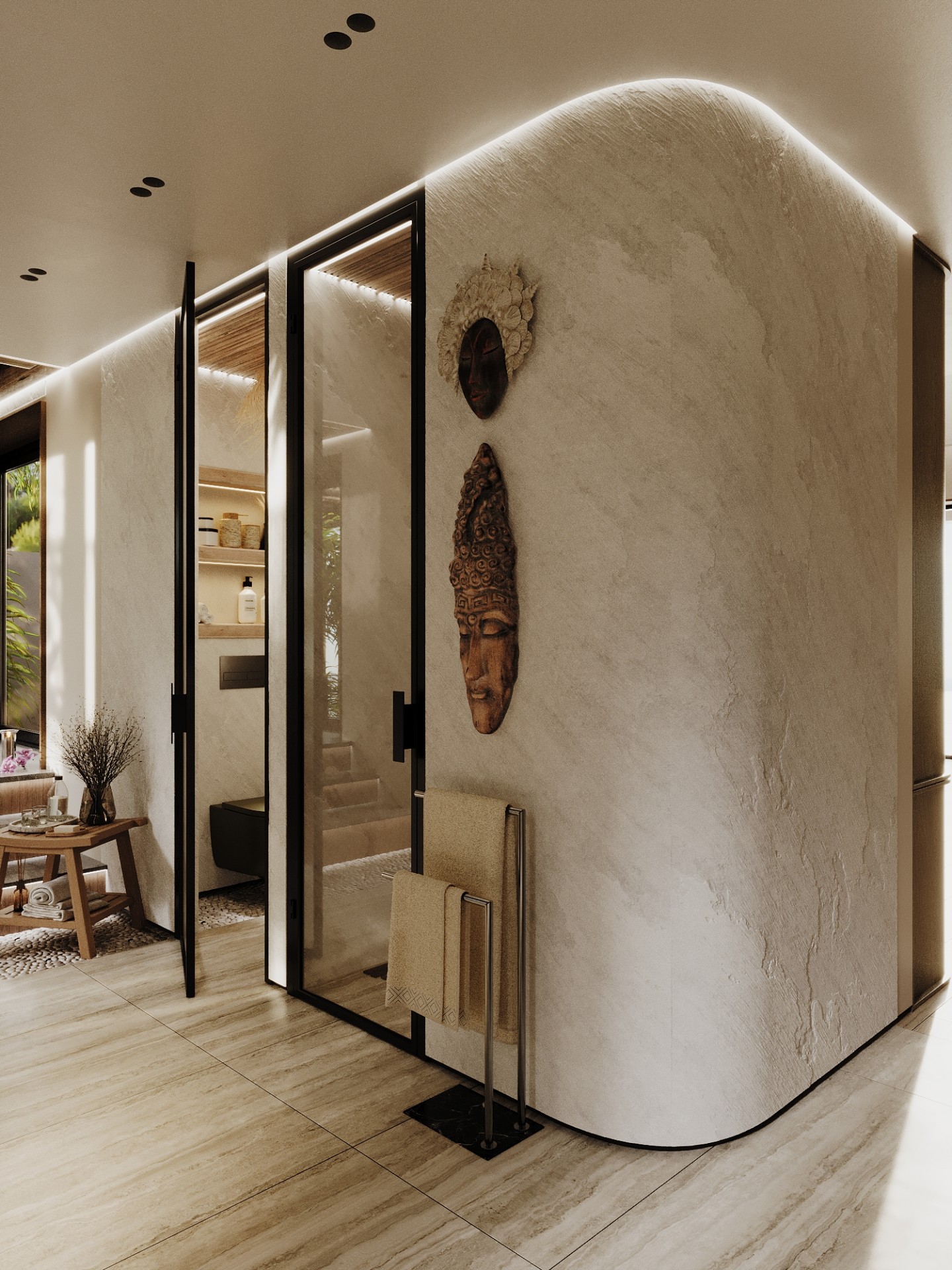 Просторные и светлые помещения оформлены с уважением к природе, а элементы декора, такие как стильные статуэтки Будды и ручной работы ковры, привносят в интерьер атмосферу внутреннего спокойствия и гармонии. Эти детали создают баланс между роскошью и естественностью, подчеркивая спокойствие и умиротворенность, свойственные этому уникальному уголку природы.