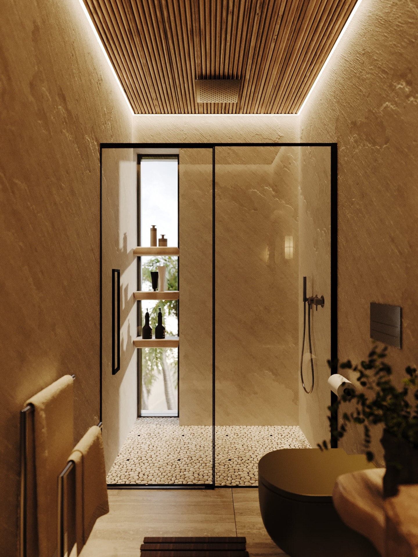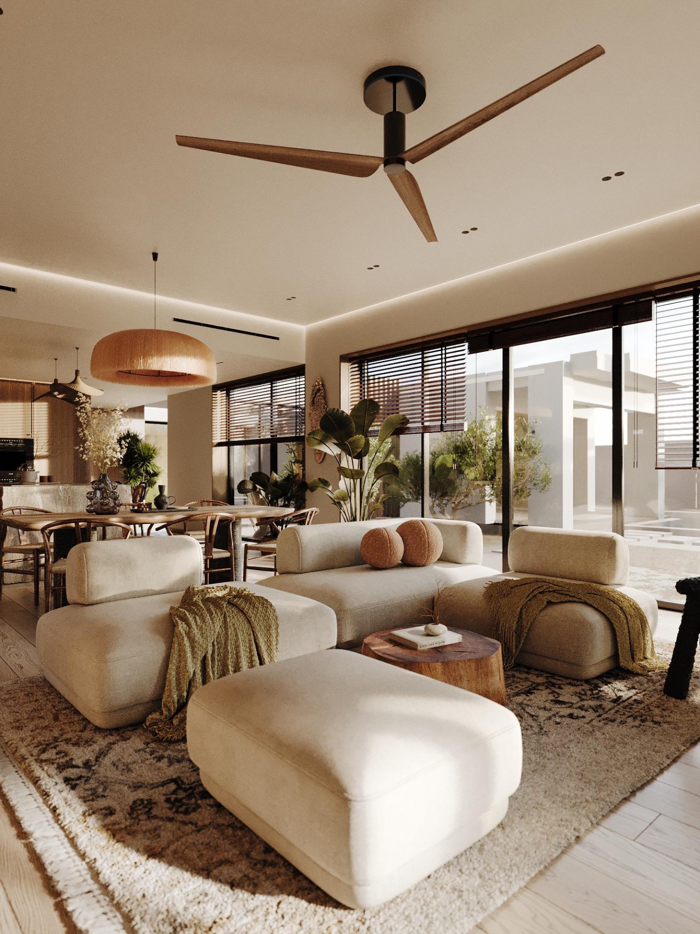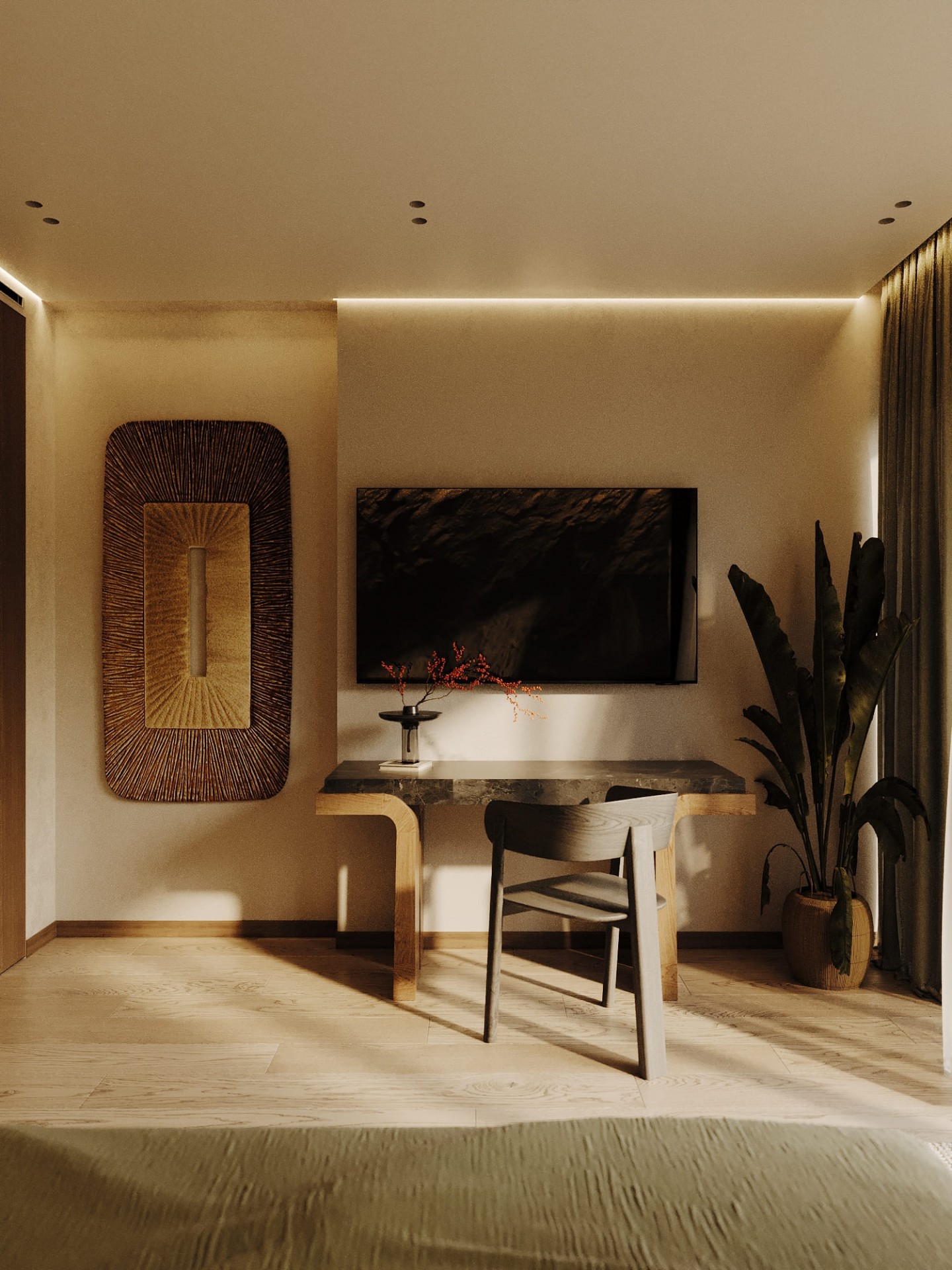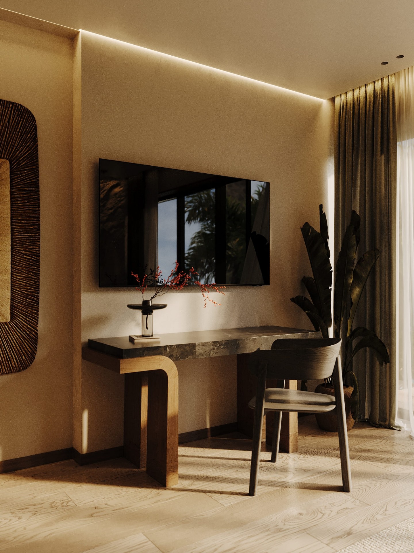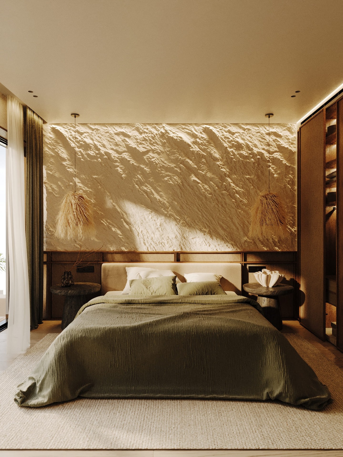 Комфортные текстуры и элементы роскоши, такие как мягкая мебель и зеркала, гармонично сочетаются с видами на побережье, делая интерьер одновременно изысканным и доступным, современным и в то же время природно связанным с окружающим миром.