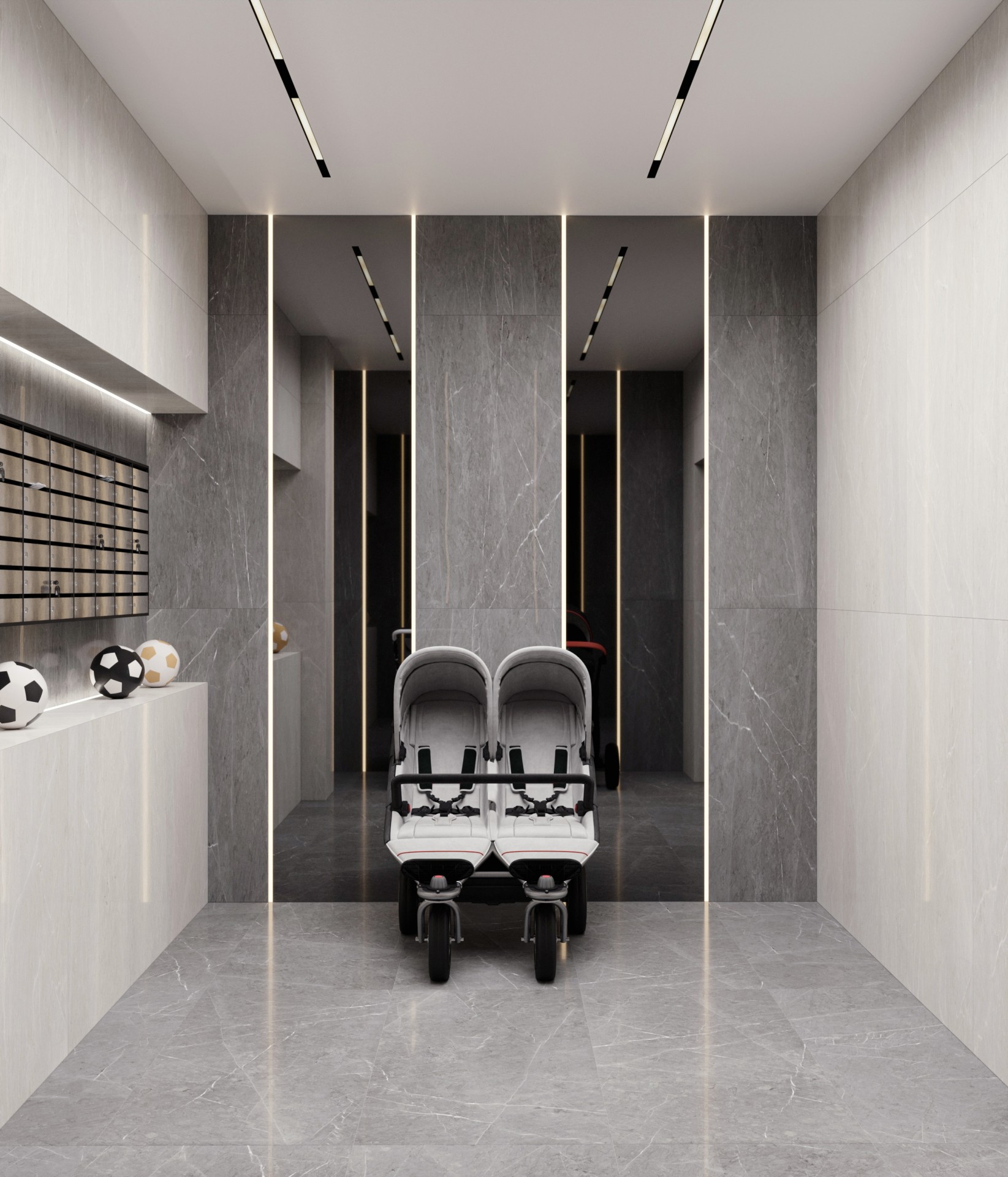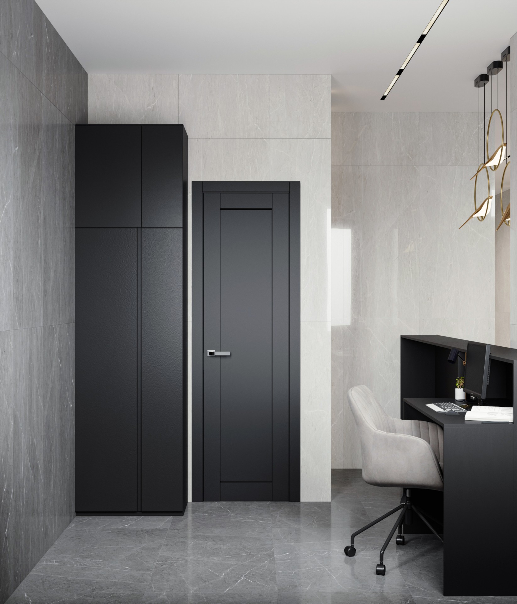 Особое внимание уделено зоне ресепшена, где установлены уникальные светильники в виде птиц. Они не только обеспечивают необходимое освещение, но и служат стильным декоративным элементом, добавляющим пространству легкости и элегантности. Этот элемент подчеркивает индивидуальность проекта и создает приятное первое впечатление.