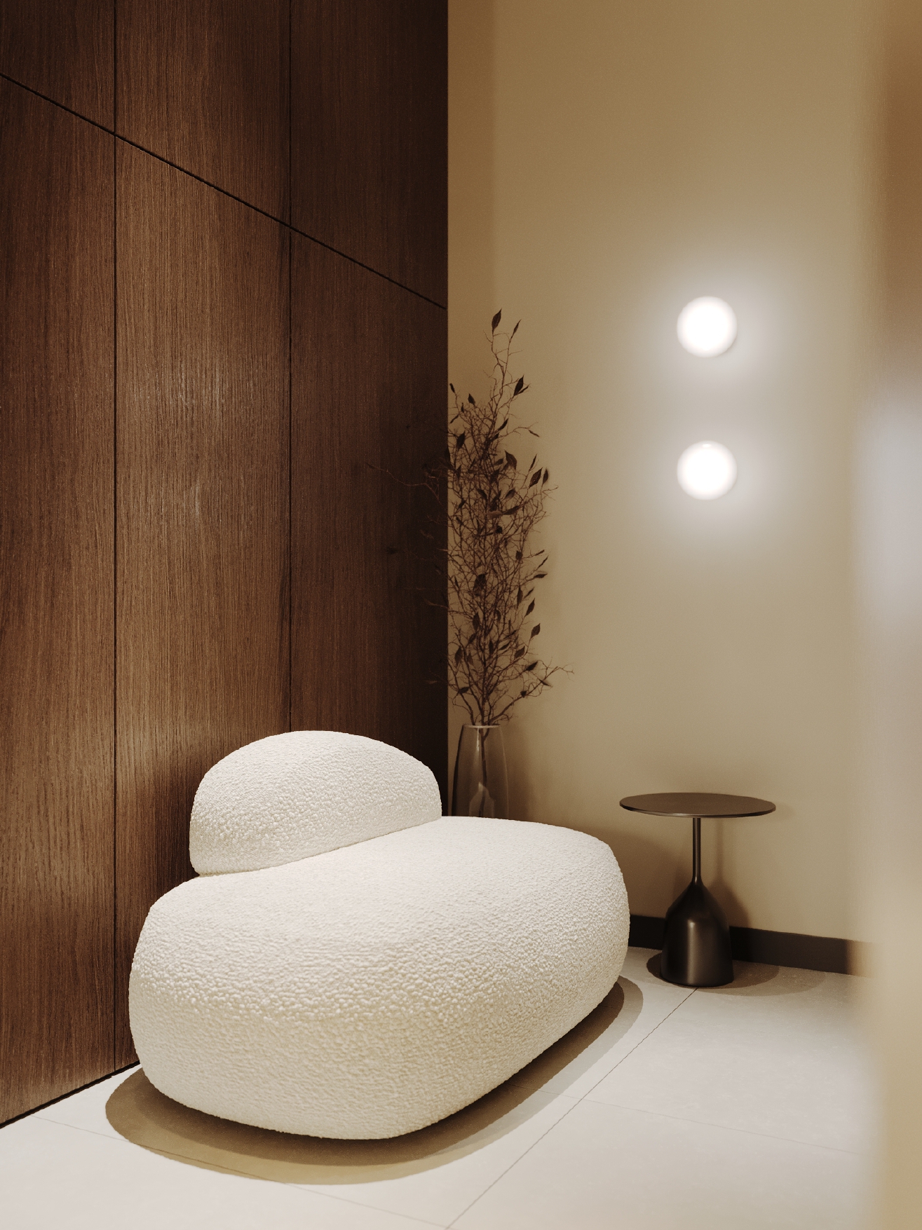 Светлая природная палитра наполняет интерьер воздухом и светом, визуально расширяя пространство. Тёплые древесные текстуры создают тактильный комфорт, а акценты из натуральных материалов — например, каменная глыба, трансформированная в журнальный столик — становятся не только выразительными деталями, но и арт-объектами, подчеркивающими концепцию.