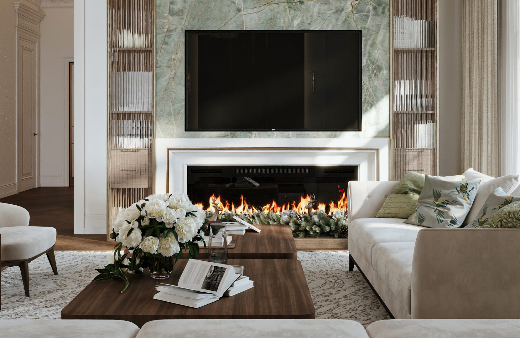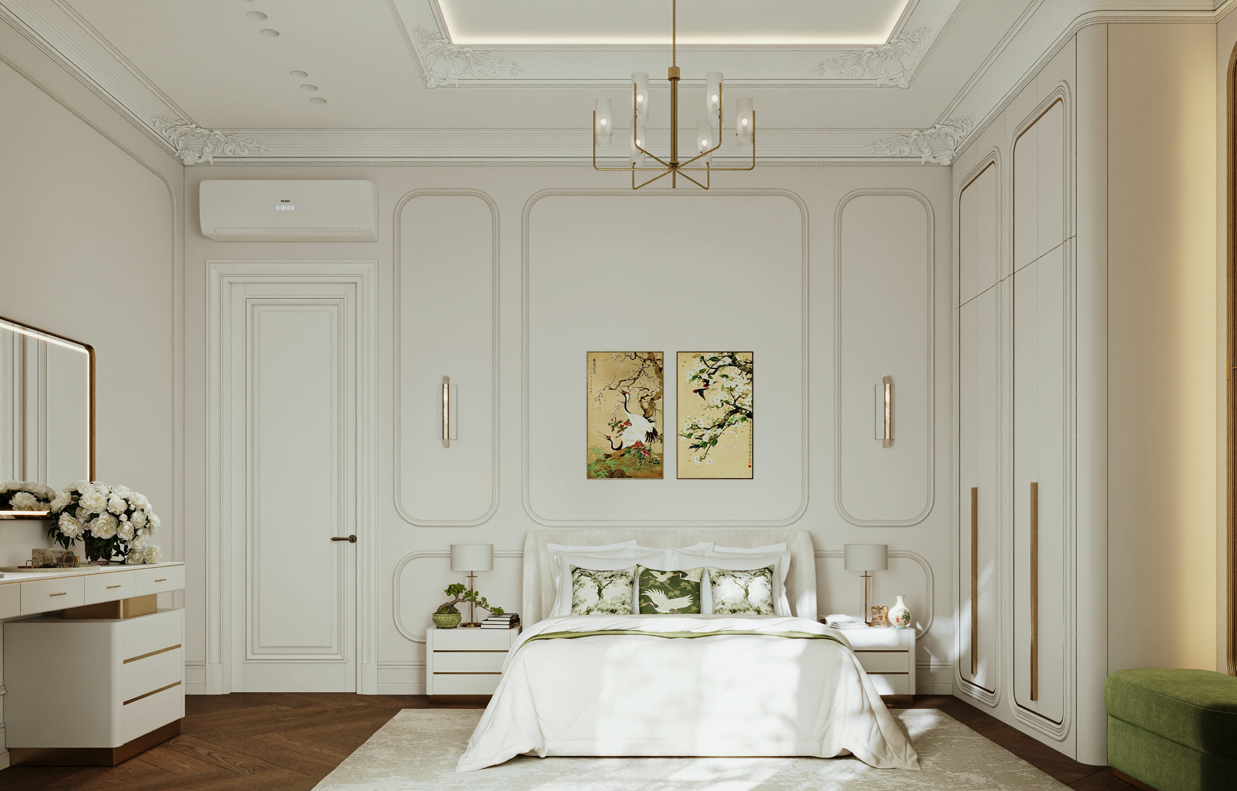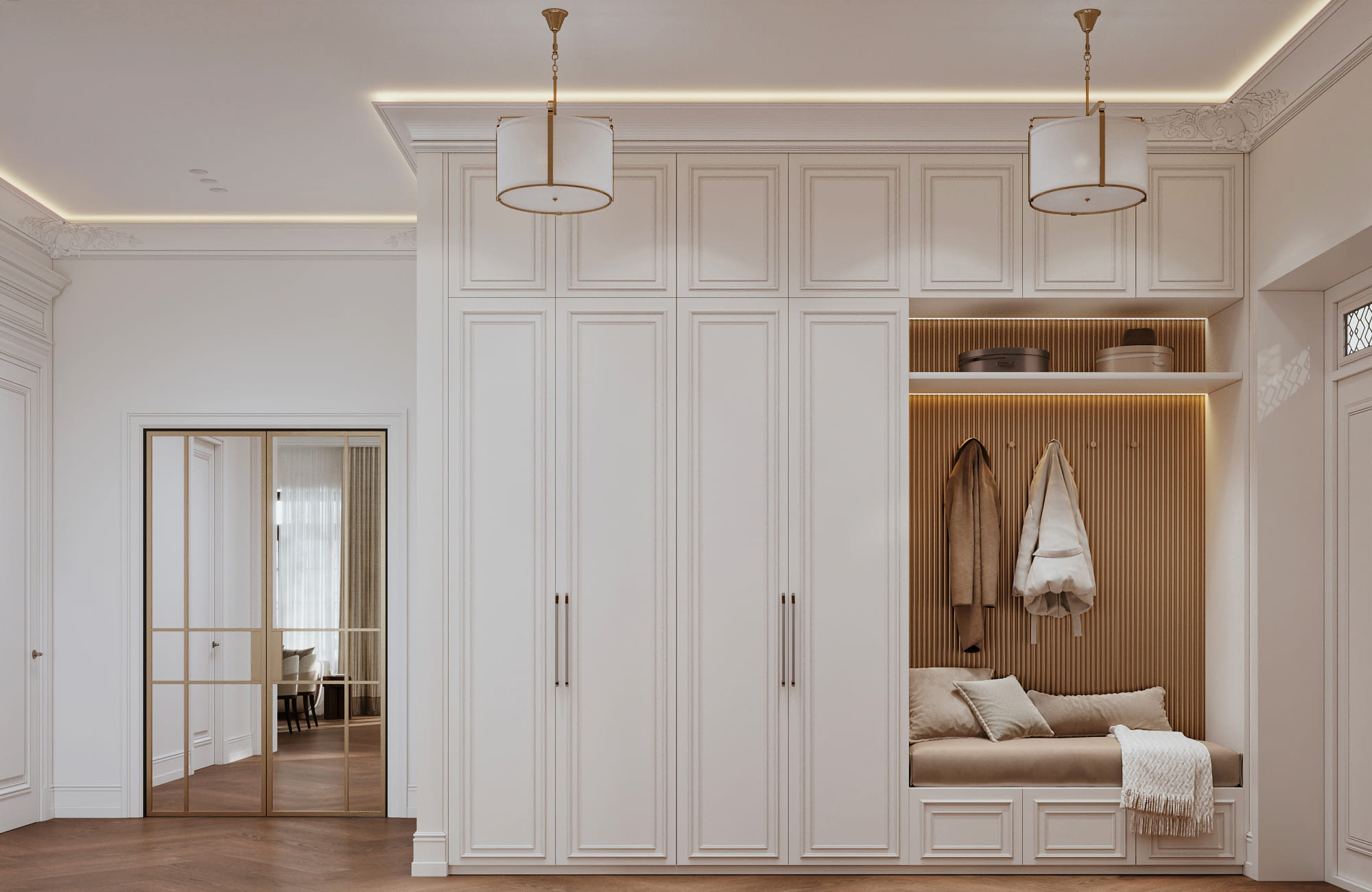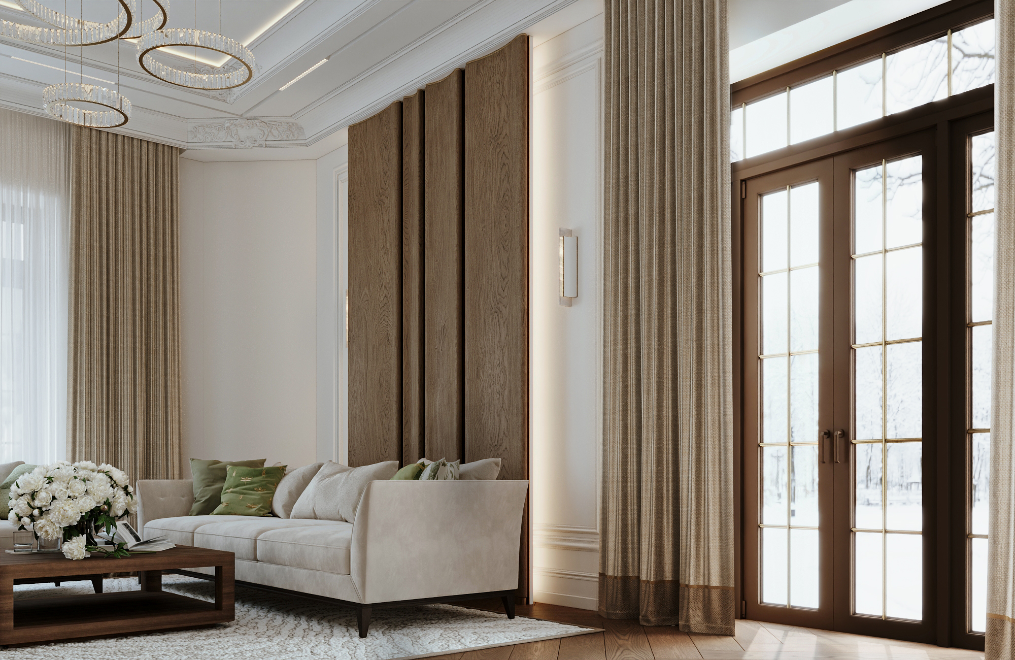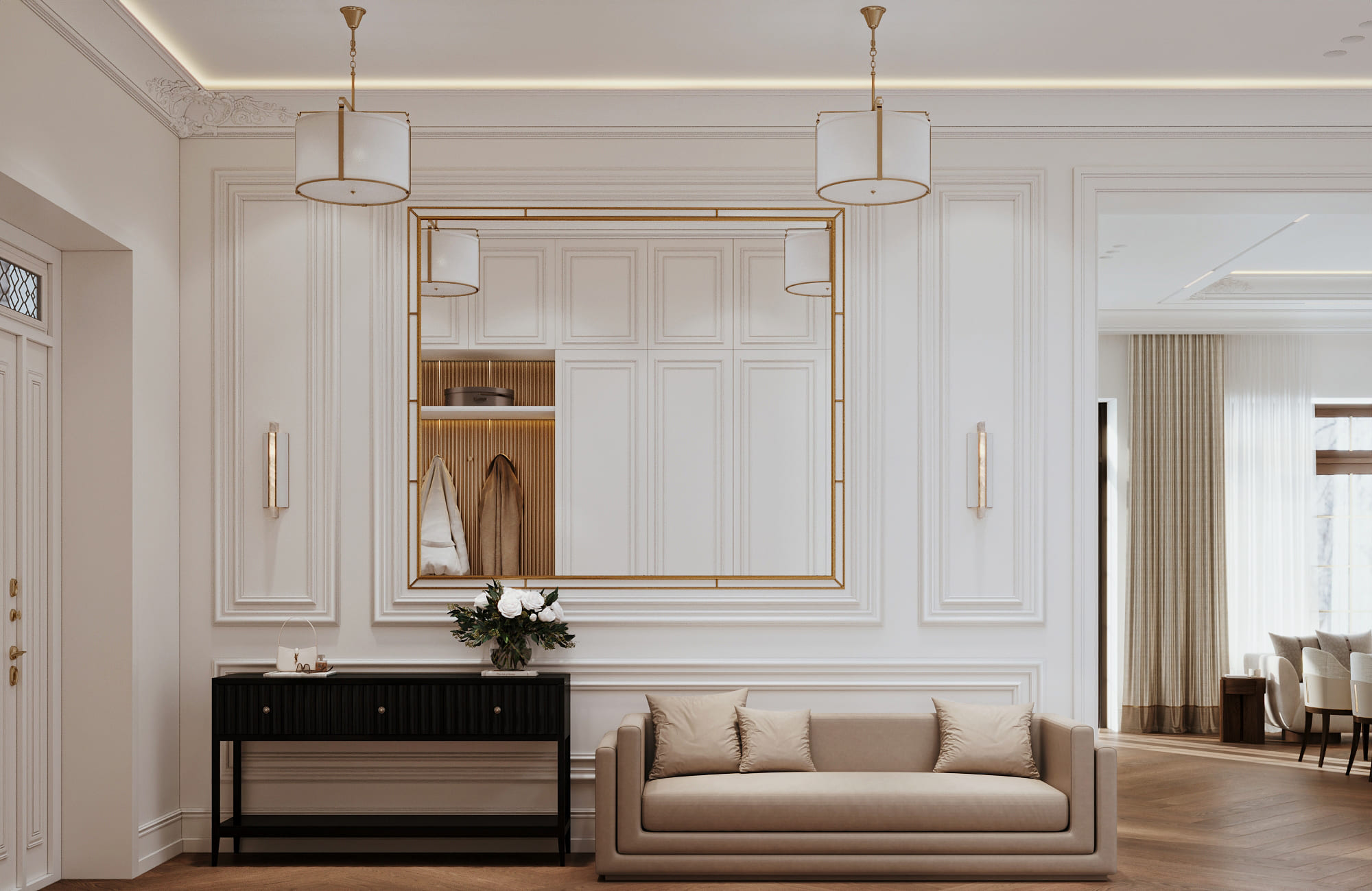 Интерьер транслирует спокойную элегантность, где нет ни чрезмерной вычурности, ни холодного минимализма. Это дом для комфортной жизни семейной пары, где можно одинаково хорошо проводить тихие вечера, встречать гостей или наслаждаться утренним кофе у окна.